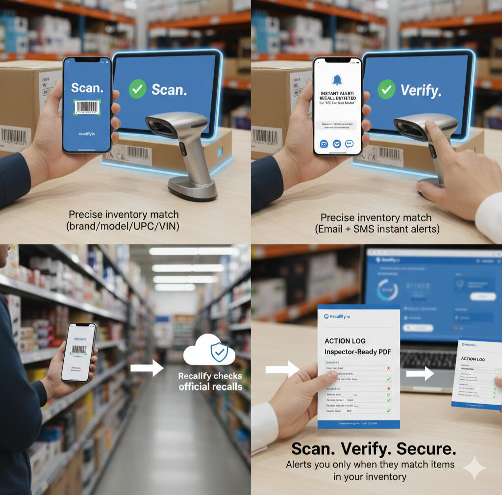 Alerts only when it’s in your inventory.Recallify matches official recalls (CPSC / FDA / USDA / NHTSA) to your exact brand / model / UPC / VIN, sends instant Email/SMS, and auto-generates a one-page Action Log PDF for inspectors.